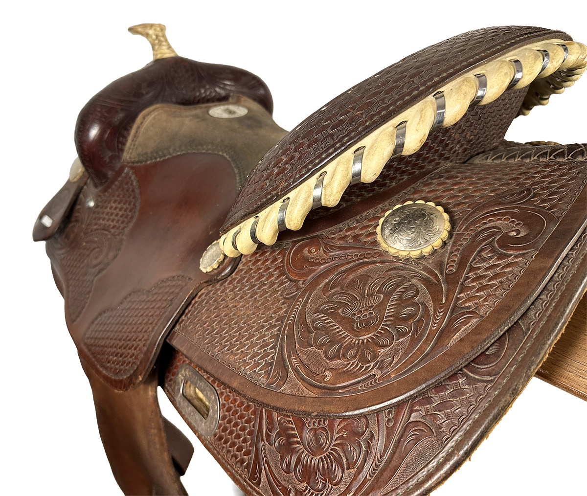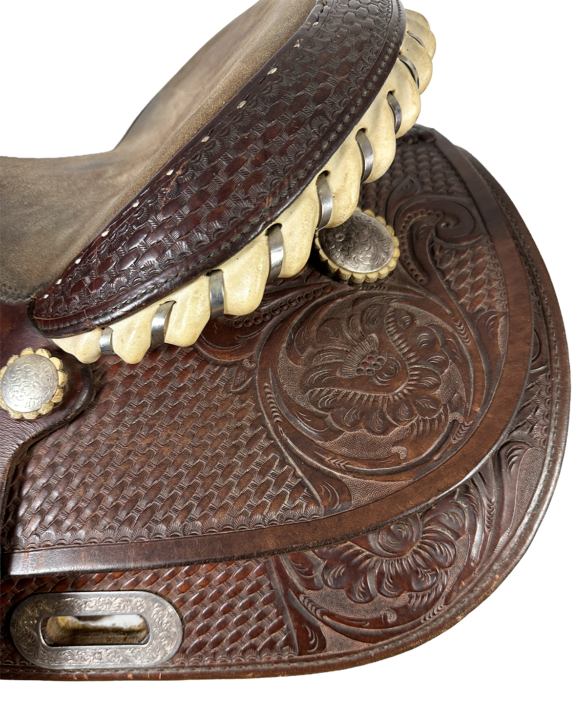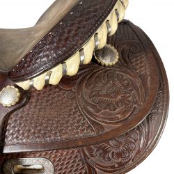 Basket und Flower Punzierungen auf Seat Jockey, Skirts und Fendern; Flat Plate vorne; Back Cinch Slot silber in Skirt; Nylon Tierstraps,
